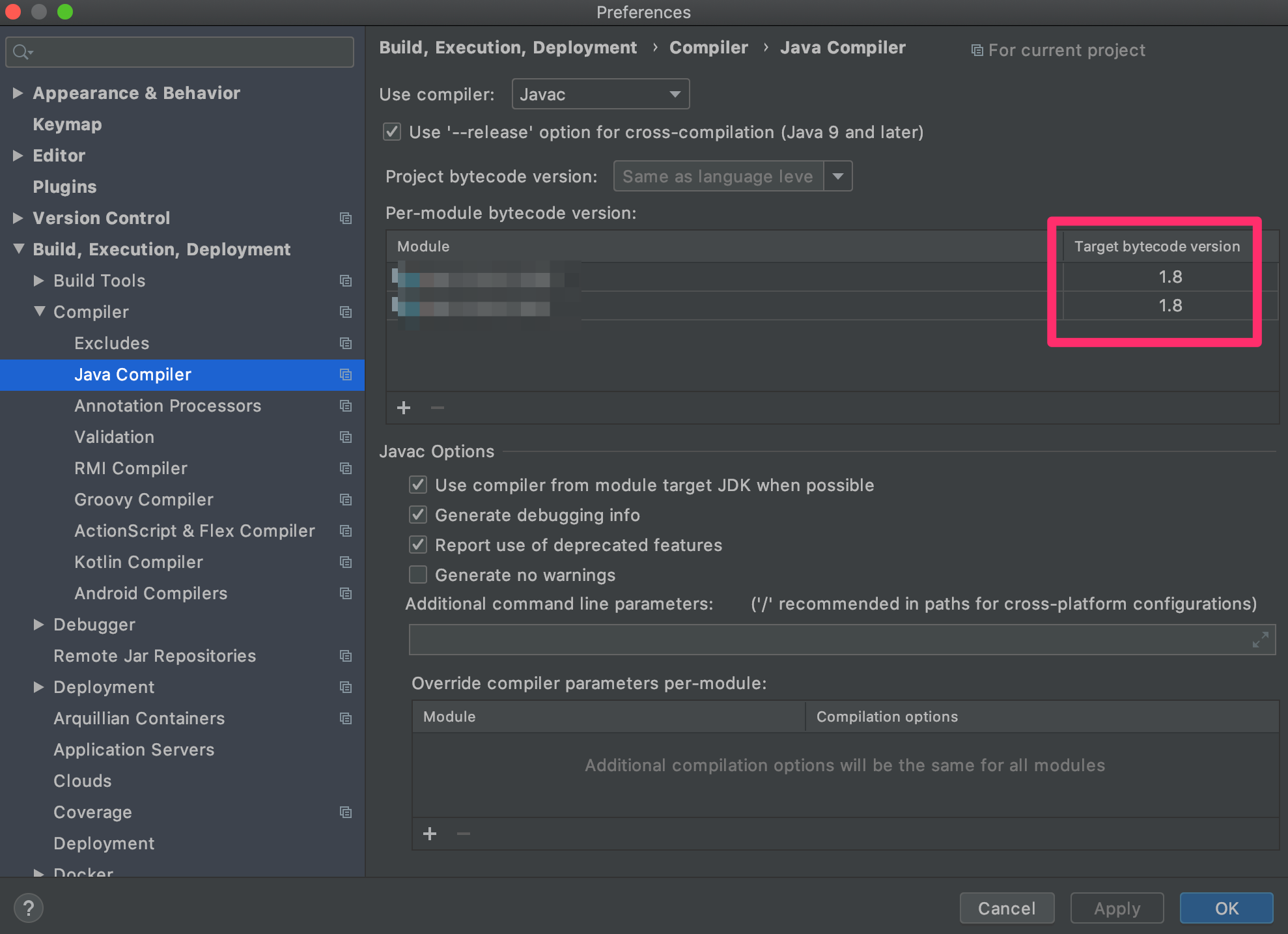 Preferences -> Build, Excecution... -> Compiler -> Per-module bytecode version