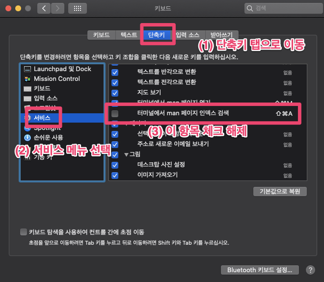 2. 단축키 탭의 서비스 메뉴에서 '터미널에서 man 페이지 인덱스 검색' 설정을 체크 해제합니다.